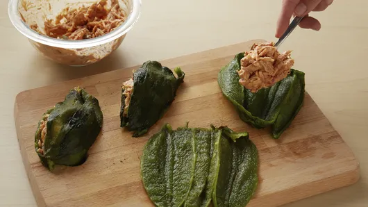 Gently rub chiles with paper towel to remove as much skin as possible. Cut top from each chile. Cut one side of chile lengthwise; open chile flat. Remove seeds. Spoon 1/2 cup cream cheese mixture on one side of chile; fold chile over top of filling.