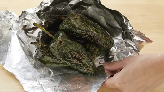 Set oven control to broil. Line cookie sheet with foil; place chiles on foil. Broil chiles 3 to 4 inches from heat about 5 minutes on each side or until skin blackens and blisters. Wrap blackened chiles in foil. Let stand 10 minutes. Turn off broiler; heat oven to 400°F. Move oven rack to middle position. Line large cookie sheet with cooking parchment paper.