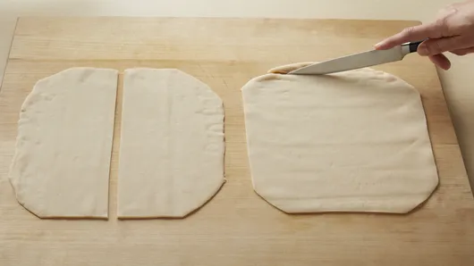 Unroll pie crusts on work surface. Trim 1/2 inch from each side of pie crusts. Press each to form 10-inch square with rounded corners. Cut each square in half to make 4 (10x5-inch) rectangles.