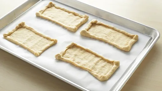 Step2On work surface, unroll dough. Press or roll to form 13x9-inch rectangle. Cut into 4 rectangles (6 1/2x4 1/2 inches), and separate. Place dough rectangles on cookie sheet.