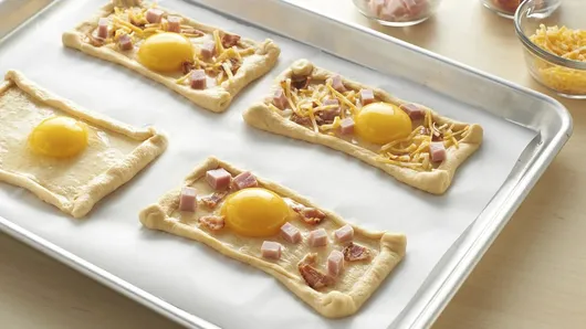 Step4Carefully break 1 egg in center of each dough rectangle. (Egg may run over slightly.) Top each with ham, bacon and cheese.