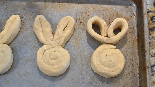 Step2Separate dough into 8 rounds. Place 1 crescent round on an ungreased baking sheet for the bunny head. Unroll another round and shape into bunny ears by meeting the 2 ends in the middle and place at the top of the bunny head on the baking sheet. Gently pinch the 2 dough pieces together (the head and the ears). Repeat with the remaining dough to make a total of 4 bunnies.