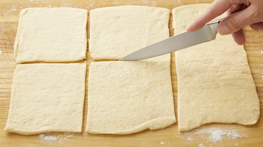 Step3Lightly flour flat work surface. Unroll 2 cans (8 oz each) Pillsbury™ Crescent Recipe Creations™ refrigerated seamless dough sheet on surface. Slightly roll out each sheet of dough until about 1/2 inch longer. Cut each sheet into 6 squares to make a total of 12 squares.