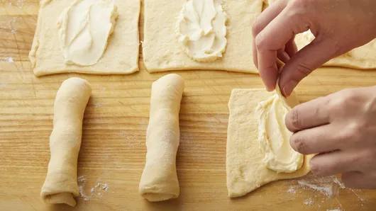 Step4Place about 1 tablespoon cream cheese filling in center of each square; spread crosswise to form long line of filling. For each roll, roll side closest to you up over filling then roll to opposite side while slightly pulling edges to make roll longer. Use pizza cutter or sharp knife to cut off ragged edges of rolls. Pinch seam into dough to secure filling in roll.