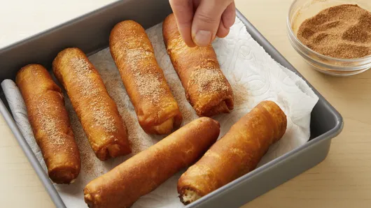 Step5In skillet, heat canola oil to 325°F. Carefully place rolls in hot oil; fry on one side 30 to 60 seconds. Turn rolls; fry until golden brown. Remove from oil; place on paper towel-lined plate.