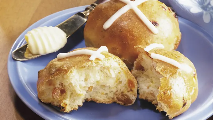 Step4In small bowl, mix powdered sugar and enough milk until smooth and drizzling consistency. With spoon, drizzle icing in cross shape on top of each bun.