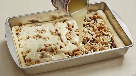 Step3Remove partially baked crust from oven. Sprinkle vanilla chips, chocolate chips, almonds and cashews evenly over crust. Pour condensed milk evenly over top.