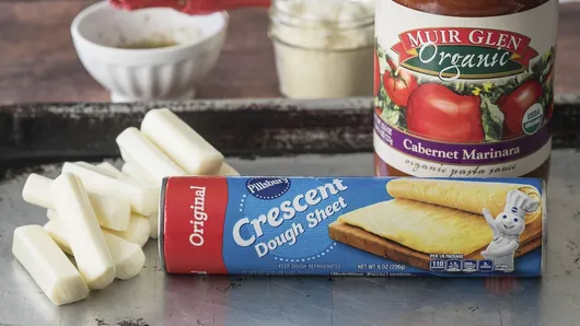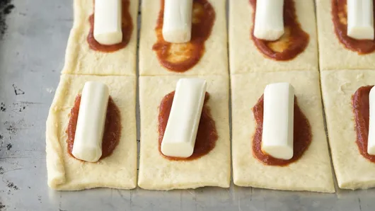 Step2Unroll 1 can (8 oz) Pillsbury™ refrigerated crescent dough sheet on ungreased cookie sheet; cut into 12 equal rectangles. Top each rectangle with 1 teaspoon Muir Glen™ organic cabernet marinara pasta sauce and half of a 1-oz mozzarella cheese stick. Roll up, taking care to pinch seams; place seam-side down on cookie sheet.