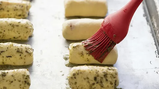 Step3In small bowl, mix 2 tablespoons melted butter and 1 teaspoon Italian seasoning; brush on top of crescent dough sticks. Sprinkle with 1 to 2 tablespoons grated Parmesan cheese.