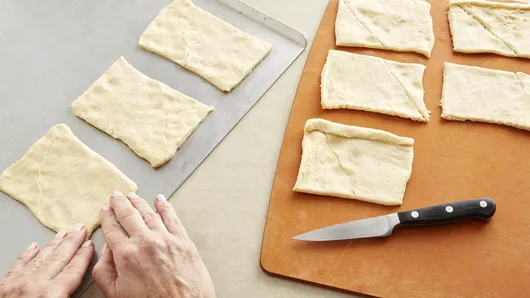 Step2Separate crescent dough into 4 rectangles; press seams together. (If using crescent dough sheet, unroll and cut into 4 equal rectangles.) Using pizza cutter or sharp knife, cut each rectangle crosswise in half. Place crescent squares on cookie sheet, and press out slightly. Bake 8 to 9 minutes or until light golden brown; remove from oven.