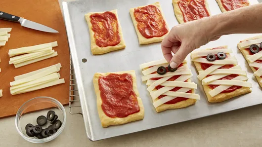 Step3Spread about 2 teaspoons of the pizza sauce on top of each crescent square. Top each with 8 strips of mozzarella cheese, alternating and overlapping strips to look like mummy bandages. Add 2 olive or pepperoni slices to each for eyes.