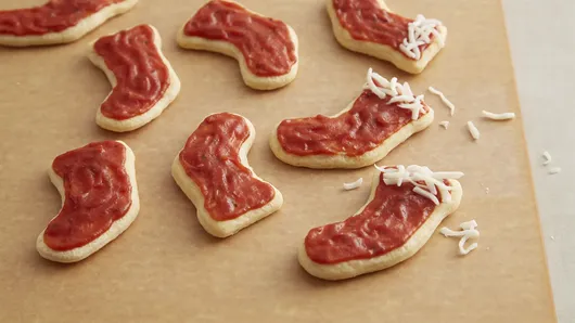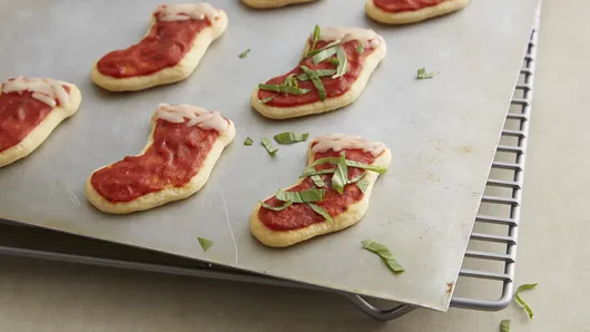 Cut adorable stockings and other holiday shapes out of a Pillsbury™ crescent dough sheet for a festive twist on pizza night. Your kids will have a ball applying their cookie decorating skills to these fun pizzas. Pile your family's favorite pizza toppings high and enjoy your creations while cozying up to watch a classic Christmas movie.