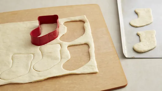 Step1Heat oven to 350°F. Unroll dough on work surface. Press into 13x8-inch rectangle. Using 2 1/2- to 3-inch stocking-shaped cookie cutter, cut 12 stockings from dough. Transfer to ungreased cookie sheet. Bake 8 minutes.