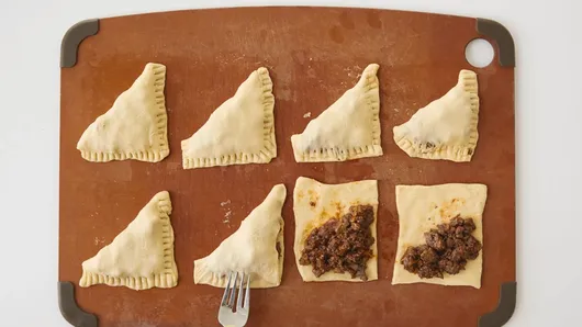 Step3Place about 2 rounded tablespoons beef mixture on center of each square. Fold dough over filling, forming triangles; press edges with fork to seal. With knife, cut small slits in tops for steam to escape. Place on ungreased cookie sheet. Brush with egg; sprinkle with sesame seed.
