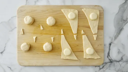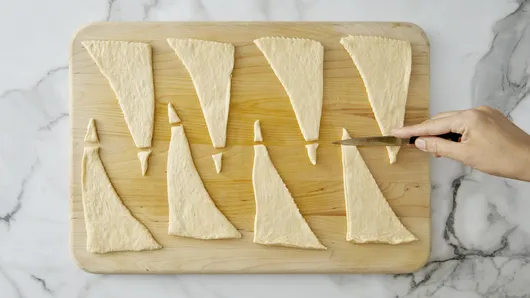 Step1Heat oven to 350°F. Line large cookie sheet with cooking parchment paper. Unroll dough on work surface; separate into 8 triangles. Cut 3/4-inch triangle from tip of each crescent triangle.