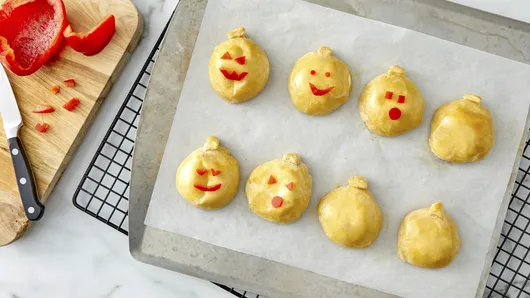 Step5Meanwhile, cut bell pepper into decorative jack-o’-lantern face shapes. Decorate each pumpkin with the pepper pieces; press in lightly. Serve warm.