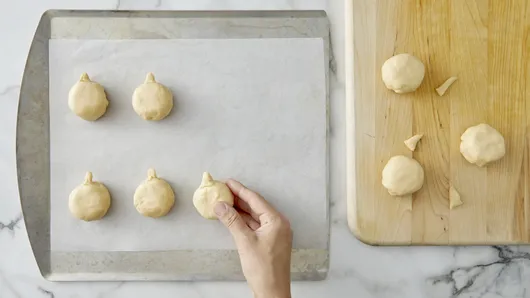Step3Turn pumpkins over, and place on cookie sheet. Roll up smaller pieces of dough, and pinch each to form the pumpkin stems. Press onto top of each pumpkin to adhere.