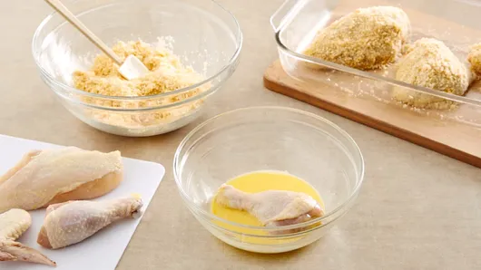 var configuration = {"title":"Crisp Oven-Fried Chicken","introduction":"Make fried chicken the easy way—in your oven! A surprise ingredient adds some seriously fantastic flavor and crunch to this easy oven-fried chicken recipe without all of the fuss (and fat) that comes with deep frying. Oh, and did we mention it preps in just 15 minutes? With a crispy oven fried chicken recipe this simple, there’s no excuse to go the drive-thru anymore. Try this recipe once, and you’ll agree!","servingSize":"1 Serving","image":{"small":{"media":"(min-width: 0px)","src":"https://mojo.generalmills.com/api/public/content/_NAt1HJu-EWrGOvK43XlMw_webp_base.webp?v=2f4c9173\u0026t=e724eca7b3c24a8aaa6e089ed9e611fd"},"medium":{"media":"(min-width: 500px)","src":"https://rms-media-prod.generalmills.com/2407e6f0-04ef-47f4-9a5e-147ef801c89e.jpg"},"large":{"media":"(min-width: 767px)","src":"https://rms-media-prod.generalmills.com/2407e6f0-04ef-47f4-9a5e-147ef801c89e.jpg"},"alt":"Crisp Oven-Fried Chicken"},"contributor":{"label":"By","name":"Pillsbury Kitchens","profileUrl":"/about-us","displayDate":{"label":"Updated","date":"Jul 2, 2019"}},"ingredientGroups":[{"ingredients":[{"quantity":"1 1/2","description":"cups mashed potato flakes"},{"quantity":"1","description":"teaspoon seasoned salt"},{"quantity":"1/2","description":"teaspoon paprika"},{"quantity":"1/4","description":"teaspoon garlic powder"},{"quantity":"1/4","description":"teaspoon pepper"},{"quantity":"1/4","description":"cup butter, melted"},{"quantity":"1","description":"tablespoon water"},{"quantity":"1","description":"egg"},{"quantity":"1","description":"(3 to 3 1/2-lb.) frying chicken, skin removed if desired"}]}],"steps":[{"description":"Heat oven to 400°F. Spray 13x9-inch pan lightly with nonstick cooking spray."},{"description":" In large bowl, combine potato flakes, seasoned salt, paprika, garlic powder and pepper. Add margarine; mix well. In medium bowl, combine egg and water; beat well.","stepShotImageUrl":"//mojo.generalmills.com/api/public/content/RCPRdVpmQU-PZY4cEwLPWQ_webp_base.webp?v=ff9d5ec1\u0026t=51a43a57af4046789e5a7f20567b1195"},{"description":"Dip chicken pieces in egg mixture; thorougly coat all sides with potato flake mixture. Place chicken, skin side up, in sprayed pan.","stepShotImageUrl":"//mojo.generalmills.com/api/public/content/G0d8G0TBLUiO9oB69qI__Q_webp_base.webp?v=eccd4990\u0026t=51a43a57af4046789e5a7f20567b1195"},{"description":"Bake uncovered at 400°F. for 55 to 60 minutes or until chicken is fork tender and juices run clear."}],"tips":[{"title":"","description":"This baked chicken comes out deep golden brown and crispy, just like fried chicken. Since the chicken is baked however, clean-up is quick and there\u0027s no oil spatter or lingering order.","category":"Recipe/Ingredient Facts","tipShots":[]},{"title":"","description":"Coat chicken, with zero mess! Seal chicken, seasonings and breadcrumbs inside a freezer bag and shake for perfectly covered, crispy results. \u003ca href=\u0022http://www.pillsbury.com/everyday-eats/8-new-things-to-do-with-freezer-bags\u0022 target=\u0022_blank\u0022\u003e More smart freezer bag tips\u003c/a\u003e.","category":"Techniques","tipShots":[]},{"title":"","description":"Potato salad, buttered baby peas and biscuits or cornbread make your chicken dinner complete.","category":"Serving Suggestions/Menu","tipShots":[]},{"title":"","description":"Traditionally, fried chicken you find at restaurants or at the store is made by cooking breaded chicken in oil on a hot stove. (If that’s what you’re craving, we have a recipe for amazing \u003ca href=\u0022https://www.pillsbury.com/recipes/buttermilk-country-fried-chicken/f5ec3deb-cc1b-41fb-83eb-941d5a95d10f\u0022 target=\u0022_blank\u0022\u003eButtermilk Fried Chicken\u003c/a\u003e.) However, this method can be a little tricky, and also not the healthiest option available to you. That’s why we love this oven-fried chicken recipe as an alternative for novice cooks and people looking for a skinnier dinner option. Since it’s baked in the oven, this recipe is more hands-off than the stove method, and also a bit better for you since it’s not cooked in oil. \r\n\r\nHave more questions about how to fry chicken, like what part of the chicken you should use or how to store and reheat leftover fried chicken? We have a comprehensive guide to \u003ca href=\u0022https://www.pillsbury.com/everyday-eats/dinner-tonight/chicken/how-to-make-fried-chicken\u0022 target=\u0022_blank\u0022\u003ehow to make the best fried chicken\u003c/a\u003e that you need to read. Loved this recipe and want to add more chicken recipes you can make in your oven to your recipe box? We have a bunch of \u003ca href=\u0022https://www.pillsbury.com/recipes/ingredient/chicken/baked\u0022 target=\u0022_blank\u0022\u003ebaked chicken dinners\u003c/a\u003e for you too.","category":"Editorial","tipShots":[]},{"title":"","description":"You can purchase a whole chicken and carve it yourself, or you can purchase pre-packaged drumsticks, breasts or thighs depending on what cut of the bird you want to serve. The legs and thighs, the darker meats, will pack more flavor. Chicken breasts are a meatier option, but won’t have as rich of a flavor as the other cuts of the chicken. ","category":"Recipe/Ingredient Facts","tipShots":[]},{"title":"","description":"Traditionally, fried chicken you find at restaurants or at the store is made by cooking breaded chicken in oil on a hot stove. (If that’s what you’re craving, we have a recipe for amazing \u003ca href=\u0022https://www.pillsbury.com/recipes/buttermilk-country-fried-chicken/f5ec3deb-cc1b-41fb-83eb-941d5a95d10f\u0022\u003eButtermilk Fried Chicken\u003c/a\u003e.) However, this method can be a little tricky.That’s why we love this oven-fried chicken recipe as an alternative for novice cooks. Since it’s baked in the oven, this recipe is more hands-off than the stove method. Have more questions about how to fry chicken, like what