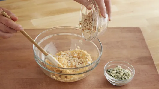 Step1Line cookie sheet with sides with waxed paper or cooking parchment paper. In medium bowl, mix cream cheese and 2 tablespoons Buffalo wing sauce. Stir in blue cheese and chicken until well blended. Shape mixture by tablespoonfuls into 16 (1 1/2-inch) balls; place on cookie sheet. Refrigerate 20 minutes.
