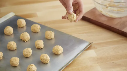 Step3In shallow dish, place melted butter. In another shallow dish, place bread crumbs. Dip dough balls into butter, then roll in bread crumbs. Place 2 inches apart on large ungreased cookie sheet.