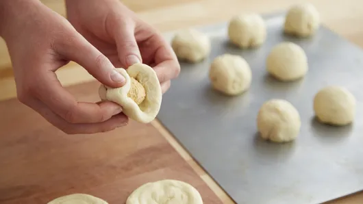 Step2Meanwhile, heat oven to 350°F. Press each dough round to 3 inches in diameter. Place 1 chicken mixture ball on center of each dough round; shape dough around ball to cover completely.