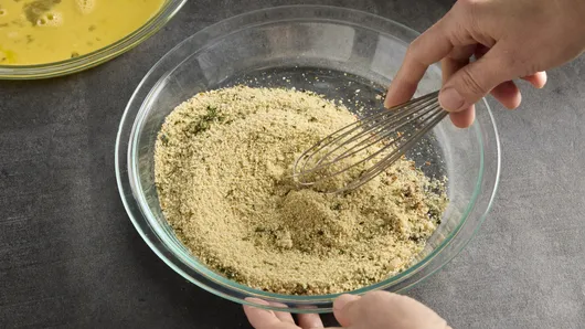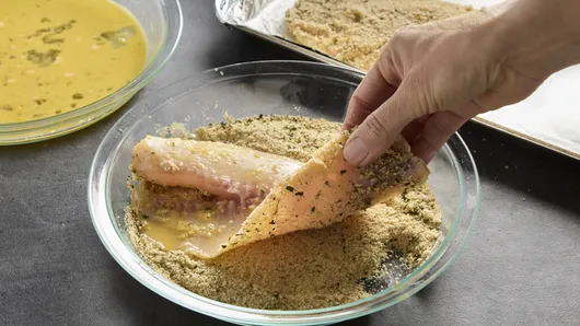 Dip the fish in the egg mixture. This will help the bread crumbs to adhere. Then, dredge in the bread crumbs to coat completely.