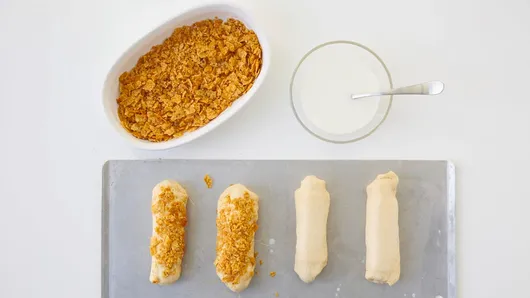 Step3Place cheese slices on rectangles; place hot dog in center of each. Fold short sides of dough over hot dogs; roll up each. Press edges to seal. Brush rolls with milk; roll in crushed chips. Place rolls, seam side down, on cookie sheet.