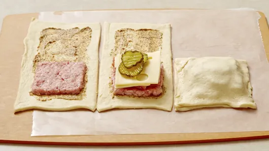 Step3Shape pork into 6 (3-inch) squares; place over mustard on each rectangle. Top each pork patty with 1 slice ham, 1 slice cheese and 3 pickle chips. Fold dough over filling; press edges firmly with fork to seal. Prick top of each pocket 3 times with fork. Place pockets 2 inches apart on cookie sheet.