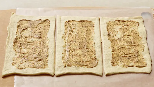 Step2In small bowl, mix mustard and cumin. Unroll dough sheets on work surface. Cut each sheet into thirds. Press each third into 7 1/2x4 1/2-inch rectangle. Spread mustard mixture evenly over each rectangle to within 1/2 inch of edges.