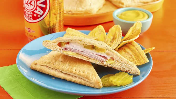 Step3Shape pork into 6 (3-inch) squares; place over mustard on each rectangle. Top each pork patty with 1 slice ham, 1 slice cheese and 3 pickle chips. Fold dough over filling; press edges firmly with fork to seal. Prick top of each pocket 3 times with fork. Place pockets 2 inches apart on cookie sheet.