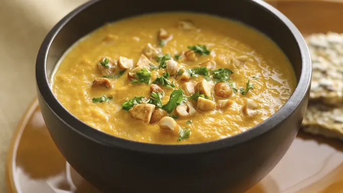 Step1Heat oven to 350°F. Lightly spray cookie sheet with Crisco® Original No-Stick Cooking Spray. In 3-quart saucepan, cook and stir 2 tablespoons of the butter, olive oil and onion over medium heat until onion is softened, about 3 minutes. Remove half of the onion with slotted spoon to small bowl; set aside to cool. To remaining onion in pan, stir in apple; cook an additional 3 minutes. Stir in curry powder, cinnamon, thyme, turmeric and celery salt; cook an additional minute, stirring constantly. Stir in soup and honey; bring to a boil. Reduce heat to low; simmer 10 minutes. Remove from heat.