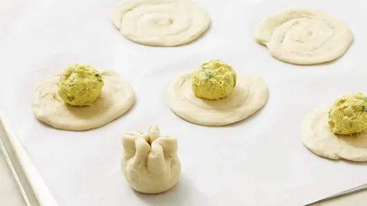 Step3Separate dough into 8 rounds. Press each to form 4-inch round. Place 1 chicken mixture ball on center of each crescent round; bring dough up around ball to cover completely. Pinch edges together on top to seal. Place seam side up 2 inches apart on cookie sheet.