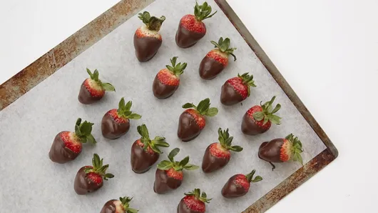 Step4Dip lower three-fourths of each strawberry into chocolate mixture; allow excess to drip off into bowl. Place on cookie sheet.