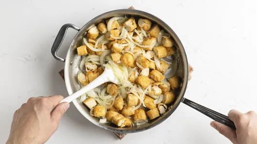 Meanwhile, in 10-inch skillet, heat butter and oil over medium heat. Add onion and garlic; cook 2 to 3 minutes, stirring frequently, until softened. Remove from heat; stir in cut-up chicken tenders.