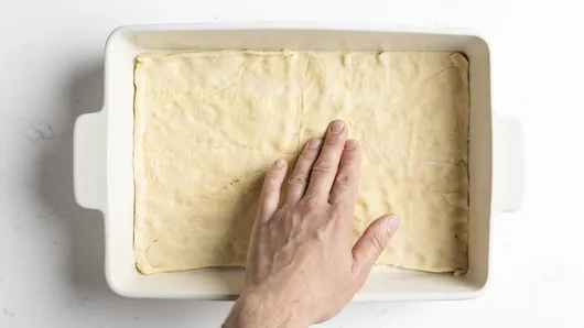 Unroll the crescent dough in a sprayed baking dish, and press perforations to seal. Bake for 10 to 13 minutes.