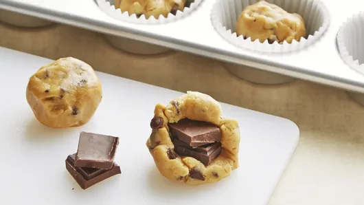 Step1Heat oven to 350°F. Place paper baking cup in each of 16 regular-size muffin cups. Break bar into 16 smaller bars for cookies. Cut each small bar of chocolate in half.