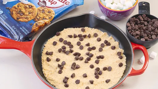 Step2Sprinkle 3/4 cup graham cracker crumbs in bottom of ungreased 9-inch cast-iron or ovenproof skillet. Scatter about 2 tablespoons of the 1 cup semisweet chocolate chips over cracker crumbs.