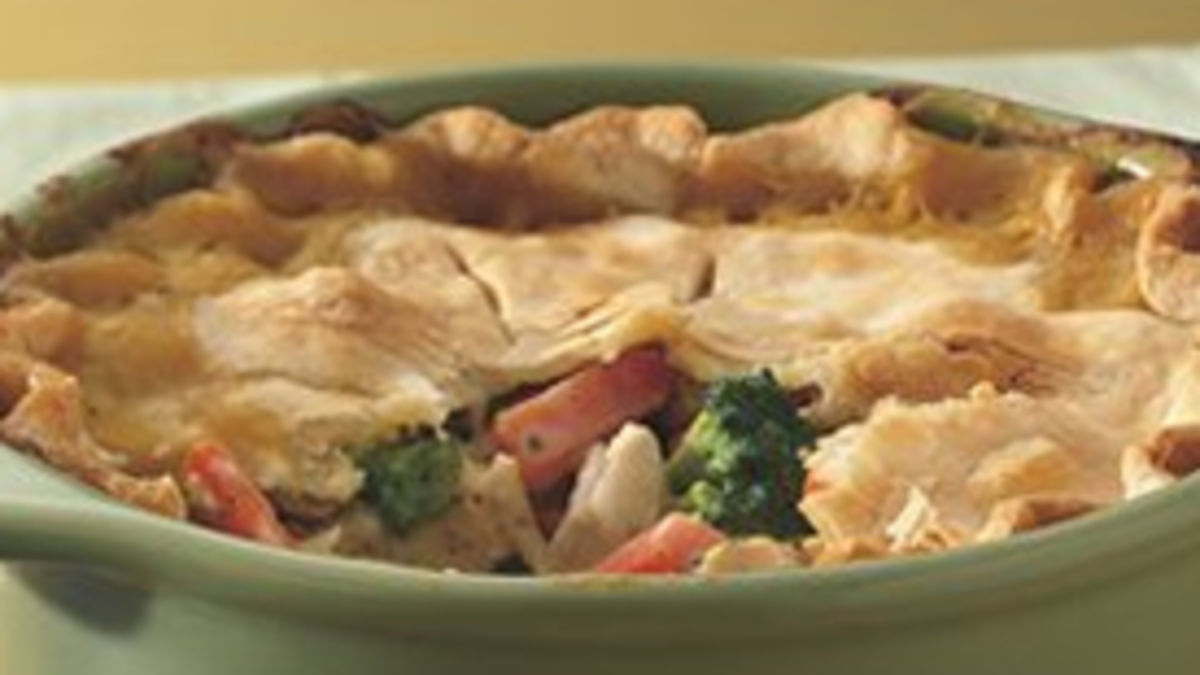 Step3Remove pie crust from pouch; place flat over turkey mixture. Roll up edge of crust to fit top of casserole; flute edge. Cut slits in several places in crust.