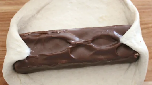 Step2Place 1 candy bar in center of each biscuit. Wrap dough around each to completely cover candy bar; pinch to seal well.