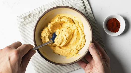 Add all remaining ingredients to the yolks except paprika; mix together until fluffy.