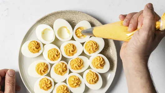 var configuration = {"title":" Deviled Eggs","introduction":"\u003cp\u003eClassic appetizers like Deviled Eggs are not only nostalgic, but they’re also honed to perfection through years of home-cook testing. This Deviled Eggs recipe is no exception! A traditional take on Deviled Eggs, it’s the perfect quick appetizer recipe for any gathering.\u003c/p\u003e\u003cp\u003eThough some deviled egg recipes get fancy with the ingredients, this one sticks to the basics. We used simple ingredients and straightforward instructions to create a recipe that you can whip together in less than 40 minutes. Whether you’re running late or just want the classic deviled egg taste, this recipe is the one for you.\u003c/p\u003e","servingSize":" 1 Deviled Egg","image":{"small":{"media":"(min-width: 0px)","src":"https://mojo.generalmills.com/api/public/content/4xDH10PgT8SG8nQBcfnF6A_webp_base.webp?v=c03f1646\u0026t=e724eca7b3c24a8aaa6e089ed9e611fd"},"medium":{"media":"(min-width: 500px)","src":"https://mojo.generalmills.com/api/public/content/4xDH10PgT8SG8nQBcfnF6A_webp_base.webp?v=c03f1646\u0026t=191ddcab8d1c415fa10fa00a14351227"},"large":{"media":"(min-width: 767px)","src":"https://mojo.generalmills.com/api/public/content/4xDH10PgT8SG8nQBcfnF6A_webp_base.webp?v=c03f1646\u0026t=191ddcab8d1c415fa10fa00a14351227"},"alt":" Deviled Eggs"},"contributor":{"label":"By","name":"Edited by Joanna","profileUrl":"/about-us/joanna","displayDate":{"label":"Updated","date":"Dec 3, 2025"}},"ingredientGroups":[{"ingredients":[{"quantity":"12","description":"eggs"},{"quantity":"1","description":"teaspoon dry mustard or 2 teaspoons prepared mustard"},{"quantity":"","description":"Dash pepper"},{"quantity":"1/3","description":"cup mayonnaise or sour cream"},{"quantity":"1","description":"tablespoon vinegar"},{"quantity":"1","description":"teaspoon Worcestershire sauce"},{"quantity":"","description":"Paprika or chopped fresh parsley"}]}],"steps":[{"description":"\u003cp\u003eIn a large saucepan, place the eggs in a single layer. Add cold water until the water is at least 1 inch above the eggs. Heat uncovered on high heat until water boils. Remove the saucepan from the heat. Cover with lid; let stand 15 minutes. Drain and immediately place eggs in cold water with ice cubes, or run cold water over eggs until completely cooled.\u003c/p\u003e","stepShotImageUrl":"//mojo.generalmills.com/api/public/content/2Rk3994aRpWWAaZ9SYi60g_webp_base.webp?v=713013fd\u0026t=51a43a57af4046789e5a7f20567b1195"},{"description":"\u003cp\u003ePeel eggs; halve lengthwise. Remove yolks and place in a small bowl, setting egg whites aside. Mash yolks with fork.\u003c/p\u003e","stepShotImageUrl":"//mojo.generalmills.com/api/public/content/DRe1GvFNShWtTx9IAGaXjA_webp_base.webp?v=ac935985\u0026t=51a43a57af4046789e5a7f20567b1195"},{"description":"\u003cp\u003eAdd all remaining ingredients to the yolks except paprika; mix together until fluffy.\u003c/p\u003e","stepShotImageUrl":"//mojo.generalmills.com/api/public/content/JHIsivl8TmeXIXOgmbl7yA_webp_base.webp?v=437c31ef\u0026t=51a43a57af4046789e5a7f20567b1195"},{"description":"\u003cp\u003eSpoon or pipe yolk mixture into egg white halves. Sprinkle with paprika.\u003c/p\u003e","stepShotImageUrl":"//mojo.generalmills.com/api/public/content/SZw35otRQKSqEkRp4ZQNtQ_webp_base.webp?v=49f5b59c\u0026t=51a43a57af4046789e5a7f20567b1195"}],"tips":[{"title":"","description":"Deviled Eggs are the ultimate easy appetizer for the holidays, parties, game day, and more. Whip up a platter with this easy Deviled Egg recipe!","category":"Rich Snippet","tipShots":[]},{"title":"","description":"Short on time? Purchase hard-boiled eggs for this stuffed egg recipe in the refrigerated section of the grocery store.","category":"Recipe/Ingredient Facts","tipShots":[]},{"title":"","description":"\u003cp\u003eHard-boiled eggs are easiest to peel when they are just cool enough to handle.\u003c/p\u003e","category":"Method Note","tipShots":[]},{"title":"","description":"\u003cp\u003eIf you don’t have piping bags, you can use a zip-top bag with the corner cut off! Just minimize the trapped air in the bag before you begin piping the filling into the egg whites.\u003c/p\u003e","category":"Method Note","tipShots":[]},{"title":"","description":"\u003cp\u003eIf you choose to pipe the filling, we recommend mixing the filling with a hand mixer or food processor. If you don’t have access to these accessories, be sure to mash it thoroughly with a fork. The smoother the filling, the easier it is to pipe into the egg whites.\u003c/p\u003e","category":"Techniques","tipShots":[]},{"title":"","description":"Recipe meets Kitchen Tested criteria. Reviewed as part of SEO improvements Oct. 2019.","category":"Kitchen Tested","tipShots":[]}],"kitchenTips":[{"title":"","description":"Short on time? Purchase hard-boiled eggs for this stuffed egg recipe in the refrigerated section of the grocery store.","category":"Recipe/Ingredient Facts","tipShots":[]},{"title":"","description":"\u003cp\u003eHard-boiled eggs are easiest to peel when they are just cool enough to handle.\u003c/p\u003e","category":"Method Note","tipShots":[]},{"title":"","description":"\u003cp\u003eIf you don’t have piping bags, you can use a zip-top bag with the corner cut off! Just minimize the trapped air in the bag before you begin piping the filling into the egg whites.\u003c/p\u003e","category":"Method Note","tipShots":[]},{"title":"","description":"\u003cp\u003eIf you choose to pipe the filling, we recommend mixing the filling with a hand mixer or food processor. If you don’t have access to these accessories, be sure to mash it thoroughly with a fork. The smoother the filling, the easier it is to pipe into the egg whites.\u003c/p\u003e","category":"Techniques","tipShots":[]}],"additionalContent":[{"title":"Recipe Ingredients","description":"\u003cp\u003eNeed an easy appetizer? Deviled Eggs to the rescue! This classic app is easy to make and comes together with simple ingredients.\u003