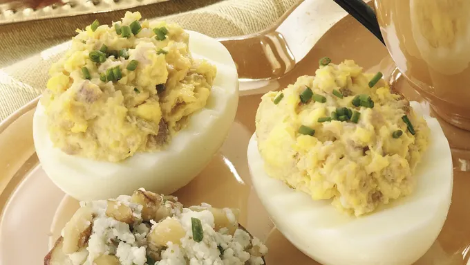 Enjoy these deviled eggs flavored with onion dip and chives - a tasty appetizer.