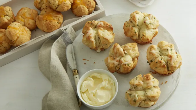 Step3Separate dough into 8 biscuits; separate each biscuit into 2 layers. Brush both sides of each biscuit with melted butter mixture. Top half of the biscuits with 1 tablespoon Cheddar cheese and 3 pickle slices. Place remaining biscuit halves on top of pickles; press edges to seal. Starting at one short end of pan, place biscuit layers on their edges, just touching each other, until pan is loosely filled. Brush with remaining melted butter mixture.