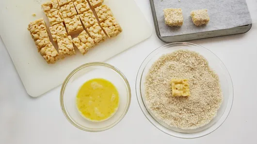 Step3Mix bread crumbs, garlic powder, salt, red pepper and 1/4 cup melted butter in shallow dish or pie plate. Beat eggs in small dish; dip macaroni squares into eggs, allowing excess to drip off, then completely coat in bread crumb mixture. Transfer to cookie sheet.