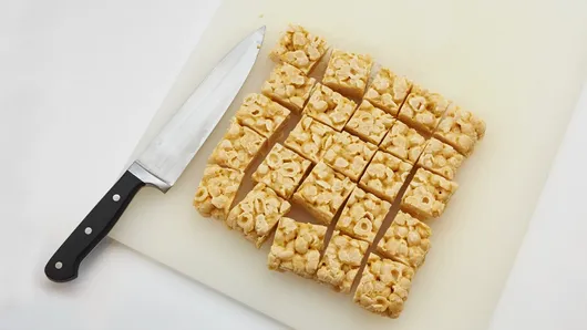 Step2Heat oven to 425°F. Line large cookie sheet with cooking parchment paper; set aside. Turn macaroni and cheese upside down onto cutting board; remove parchment paper. Cut into 5 rows by 5 rows (1 1/2-inch squares) with sharp knife.