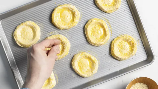 In small bowl, combine egg yolk and water; beat well. Brush over tops and sides of biscuits. Sprinkle each with sesame seed.