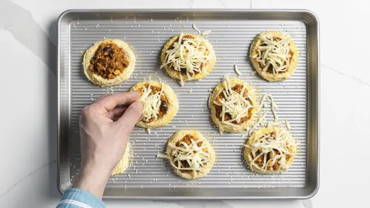 Spoon about 1/4 cup ground beef mixture into indentation in each biscuit. Sprinkle each with pizza cheese blend.