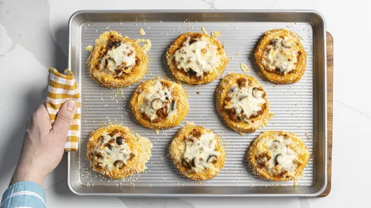 Bake at 375°F for 12 to 17 minutes, or until biscuits are golden brown and cheese is bubbly. Carefully remove from baking sheet.