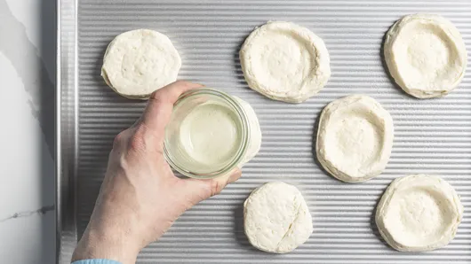 Meanwhile, separate dough into 8 biscuits. Place 2 1/2 inches apart on sprayed baking sheet. With bottom of flat 2-inch diameter glass or with fingers, press out each biscuit to form 3 1/2-inch round with 1/4-inch rim around outside edge.