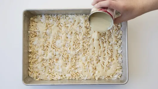 Step1Heat oven to 350°F. Grease 13x9-inch pan. In pan, break up cookie dough. With floured fingers, press dough evenly in bottom of pan. (DO NOT EAT RAW COOKIE DOUGH AFTER PRESSING DOUGH IN PAN WITH FLOURED FINGERS.) Sprinkle with 1 cup chocolate chunks; press firmly into dough. Sprinkle with coconut and almonds; drizzle with condensed milk.